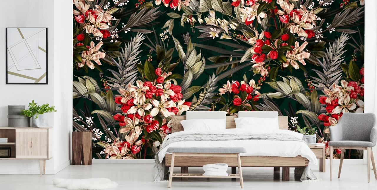 Älskarmörka blommiga tapeter och vill göra ett uttalande i ditt hem? Välj sedan denna vackra Garden Reds tapetmålning från Wallsauce.com.