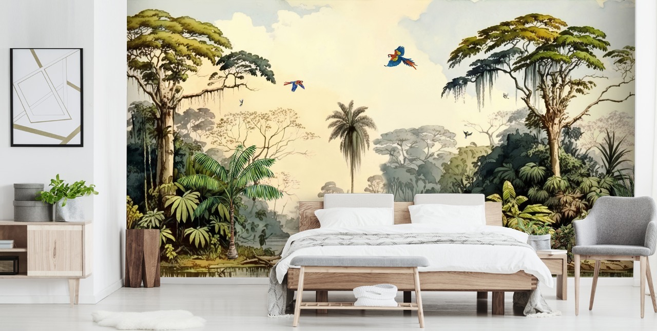 Ta med denna fantastiska tropiska miljö in i ditt hem, kontor eller företag med en paradisfåglar väggmålning från Wallsauce.