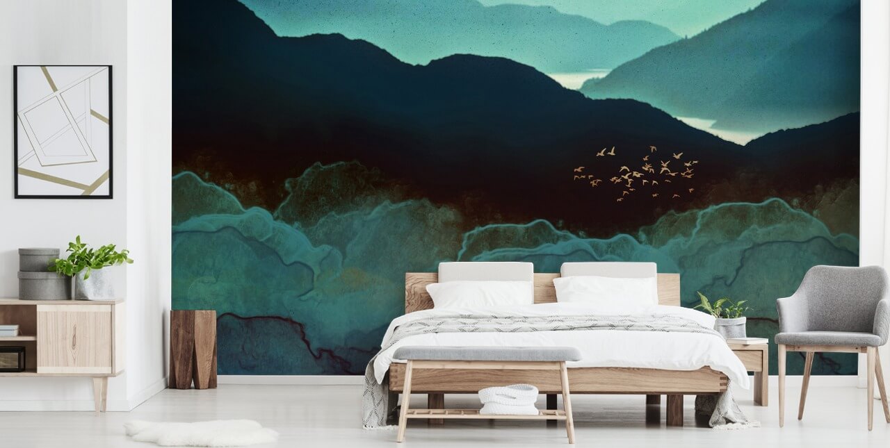 Om du vill skapa en häpnadsväckande funktionsvägg, välj sedan den här fantastiska Indigo Mountains-tapeten, designad av SpaceFrog Designs. Vi älskar de bläckblå och gröna nyanserna samt de gyllene tonerna i denna fantastiska marinblå tapet!