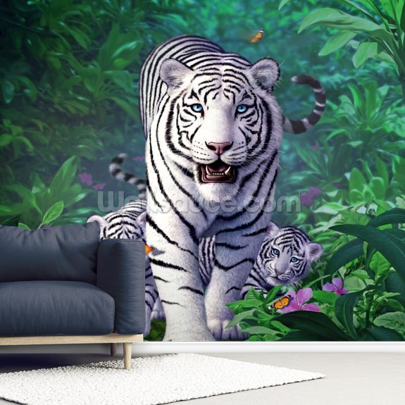 Designad av Jerry Lofo, är denna vackra White Tigers tapet väggmålning det perfekta valet om du är sugen på en vit tiger tapet! Titta bara på den vackra mamman och hennes bedårande små ungar!