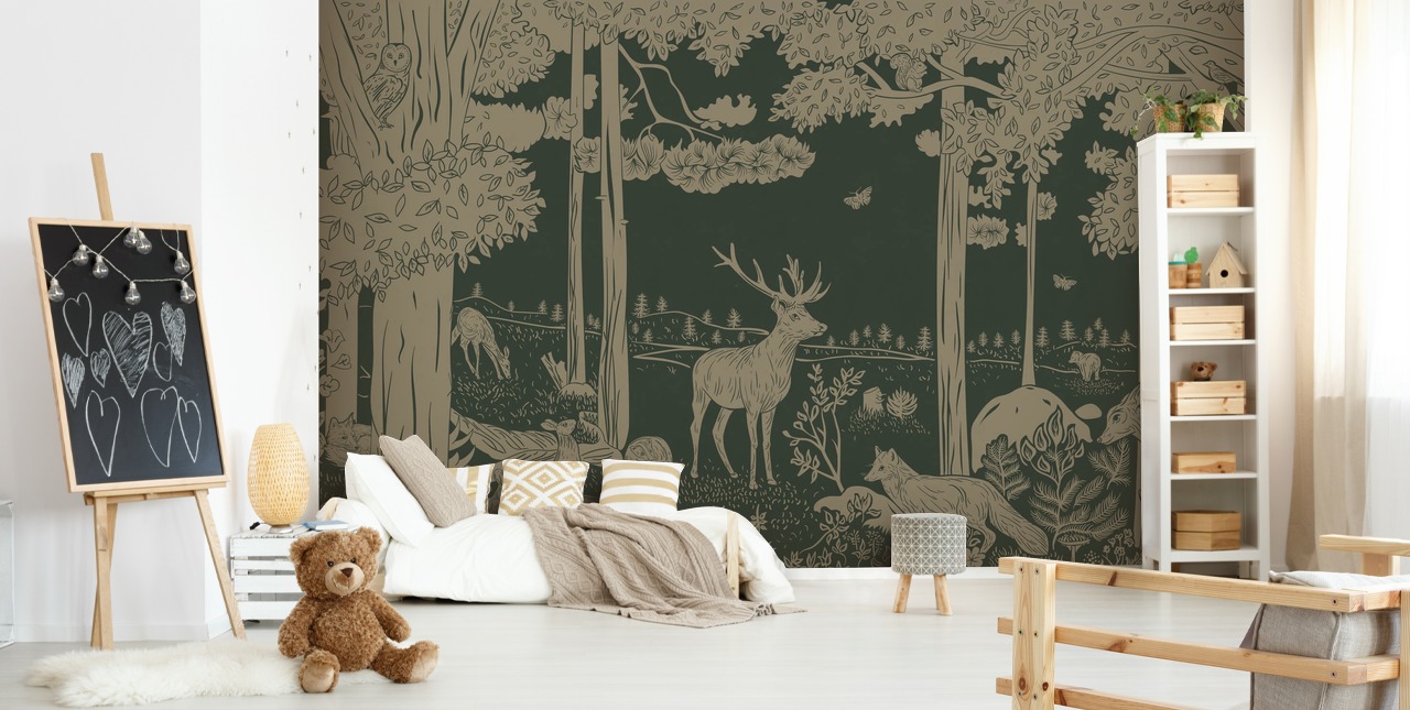 Ta med skogens magi in i ditt barns rum och låt dem leka, lära sig och växa med den vackraste bakgrunden. Monochrome Forest - Vintage Green är en charmig design av Kikki Belle, perfekt för alla små upptäcktsresande som älskar djur och leker i leran!