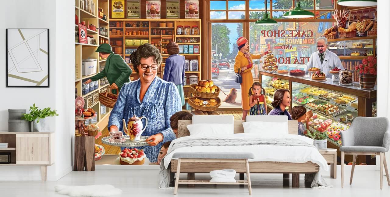 Ta tillbaka söta minnen med denna skräddarsydda Nostalgiska Cake Shop tapetväggmålning.