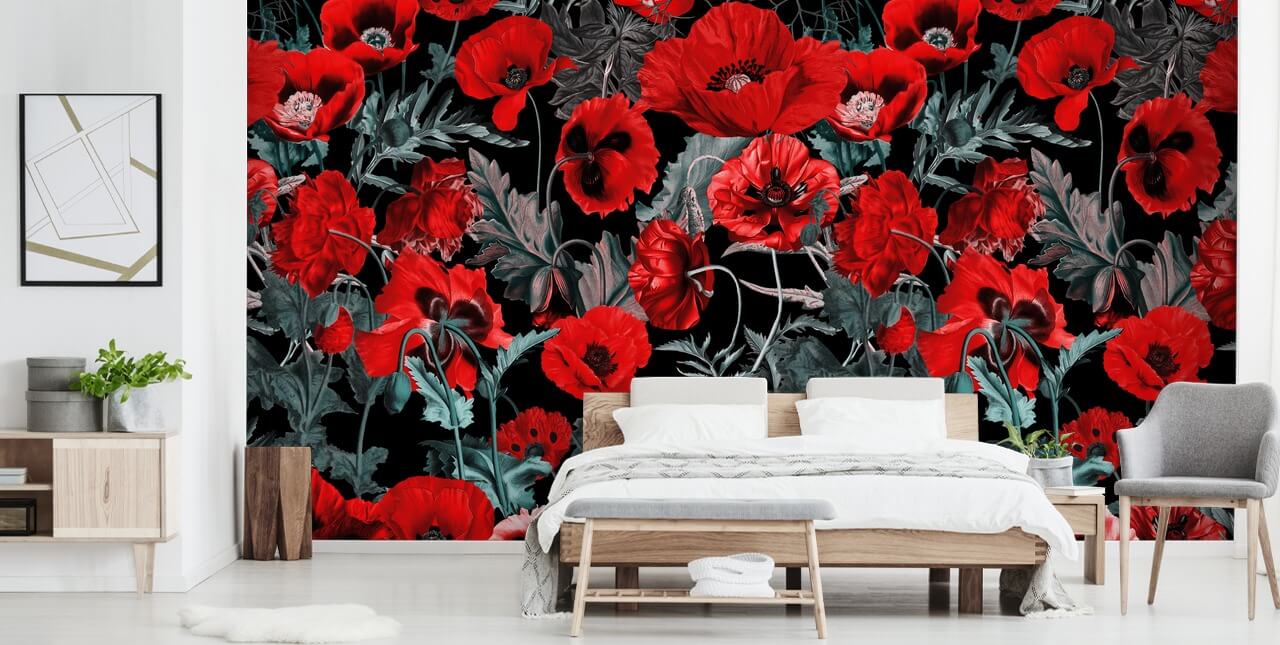 Älskarvallmo? Bli sedan kär i denna vackra Poppy Garden tapet designad av Burcu Korkmazyurek. På grund av de djärva tonerna av rött, välj en mildare färg för de återstående väggarna som pastellgrönt för att spegla bladens toner. Välj gärna mörka sängkläder för att spegla mörkret i denna mörka blommiga tapet, men var försiktig så att du inte överdriver det. Att skapa ett väldesignat mörkt sovrum handlar om balans.