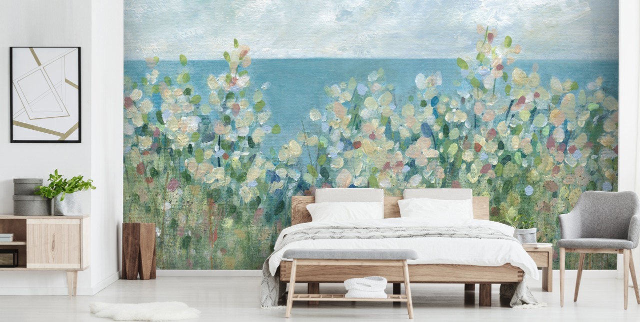 För att verkligen uppskatta de känsliga detaljerna och färgpaletten i Seaside Garden-designen uppmuntrar vi dig att beställa prover. Detta gör att du kan se hur väggmålningen interagerar med ditt utrymme och belysning, vilket hjälper dig att göra det perfekta valet för ditt hem.