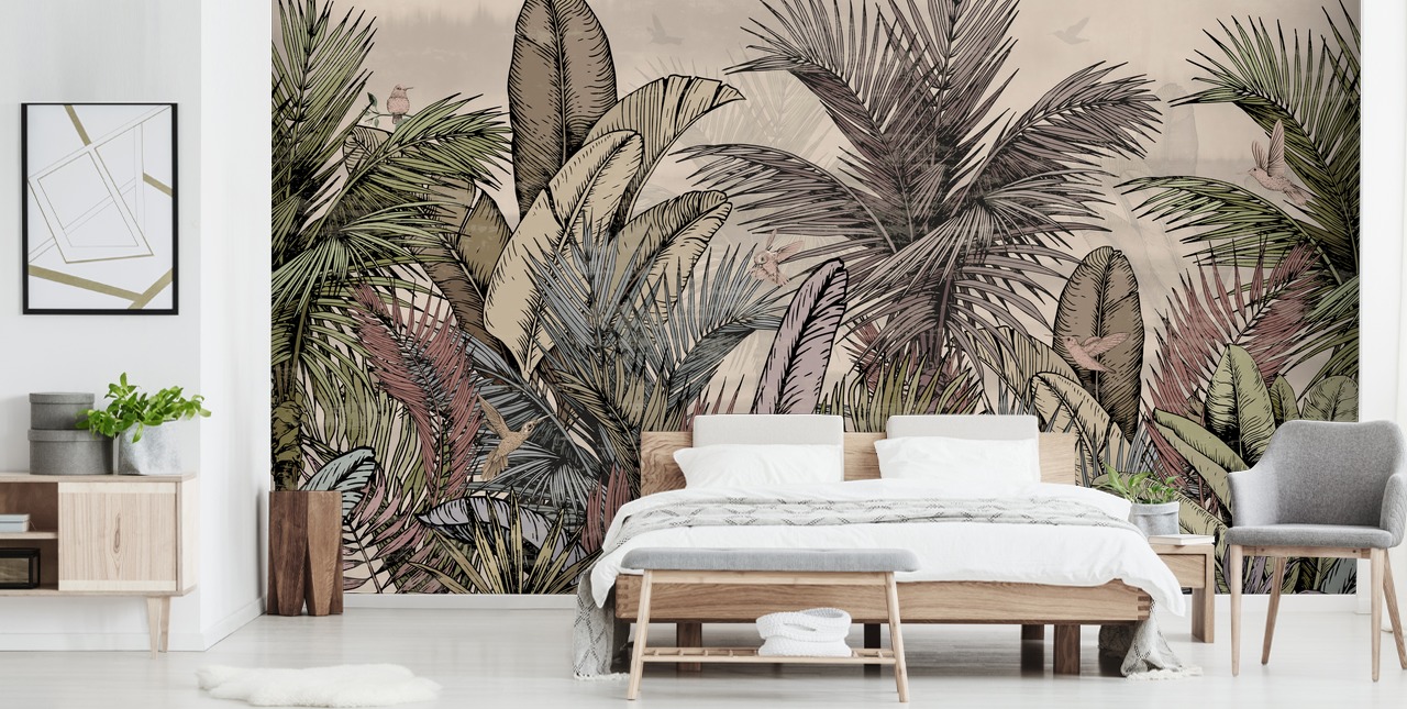 Djärv djungel Tropiska vintergröna blad i Pastel Shades tapetmålning. FSC-certifierad, PVC-fri och tillverkad för att mäta.