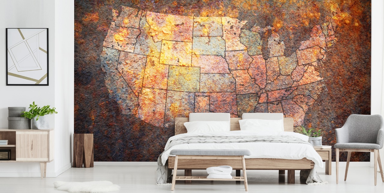 Förvandla vilket utrymme som helst med USA Map on Rust tapetväggmålning av Michael Tompsett. Om du försöker uppnå en industriell känsla i vilket utrymme som helst, är detta den perfekta kontaktpunkten för alla väggar.