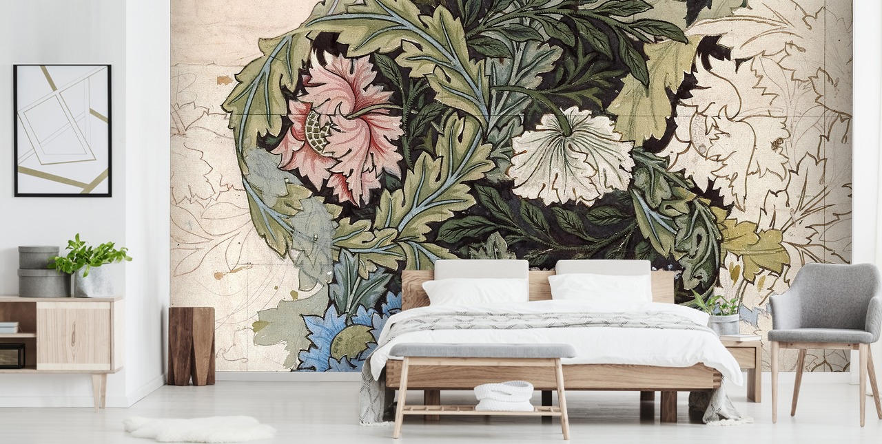 Handla denna ikoniska krans tapetväggmålning av William Morris.