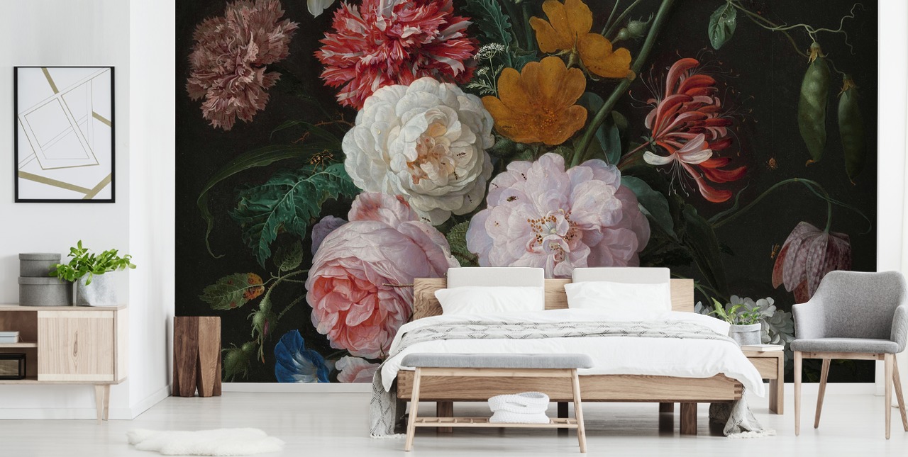 Ta med skönheten i målade blommor till din inredning med vår stilleben med blommor i en glasvas tapetmålning.
