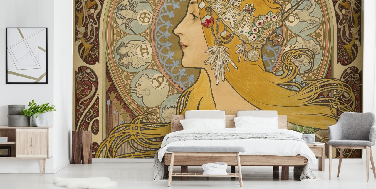 Lägg till jugendstil till ditt hem eller företag med en Zodiaque (La Plume) av Alphonse Mucha tapetmålning.