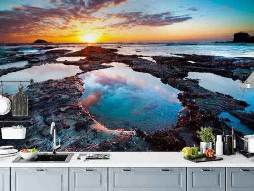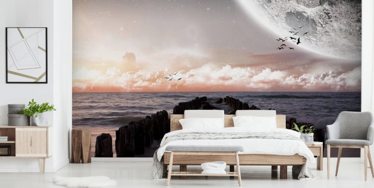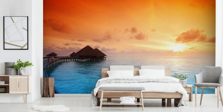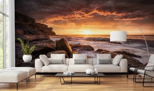röd och orange strandsolnedgång tapetväggmålning kallad Sunset Over The Sea för sovrum, kontor och badrum