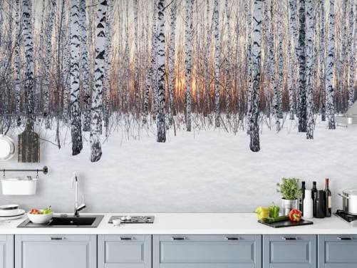 vinterskog tapetväggmålning kallad Snowy Birch Forest för sovrum