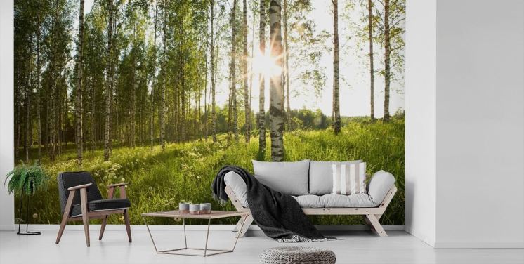 grön anpassningsbar skogstapetväggmålning kallad Birch Forest Sunlight för sovrum och kontor