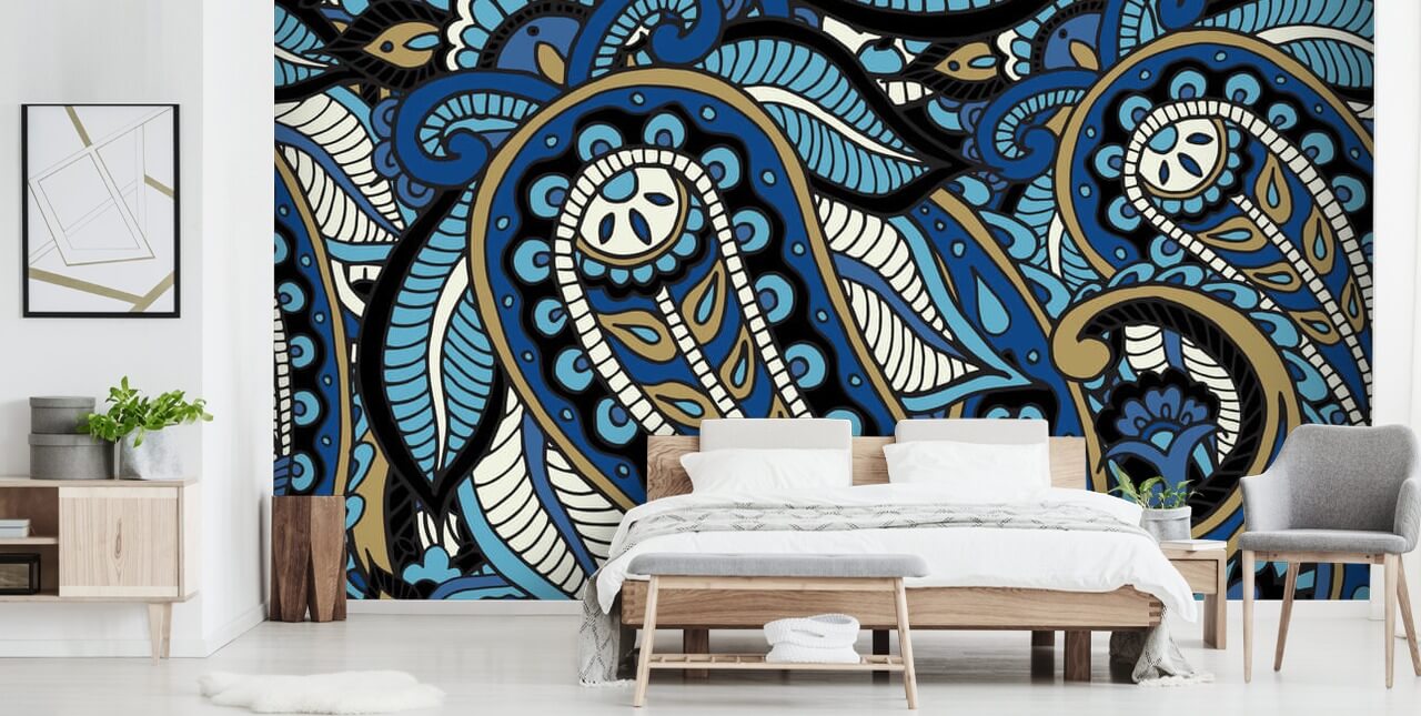 Njut av denna funky Blue Paisley Mönster tapet väggmålning i bekvämligheten av ditt eget hem. Det är perfekt för att ge ett vardagsrum en makeover, lägga till färg i ditt sovrum eller skapa en funktion i korridoren.