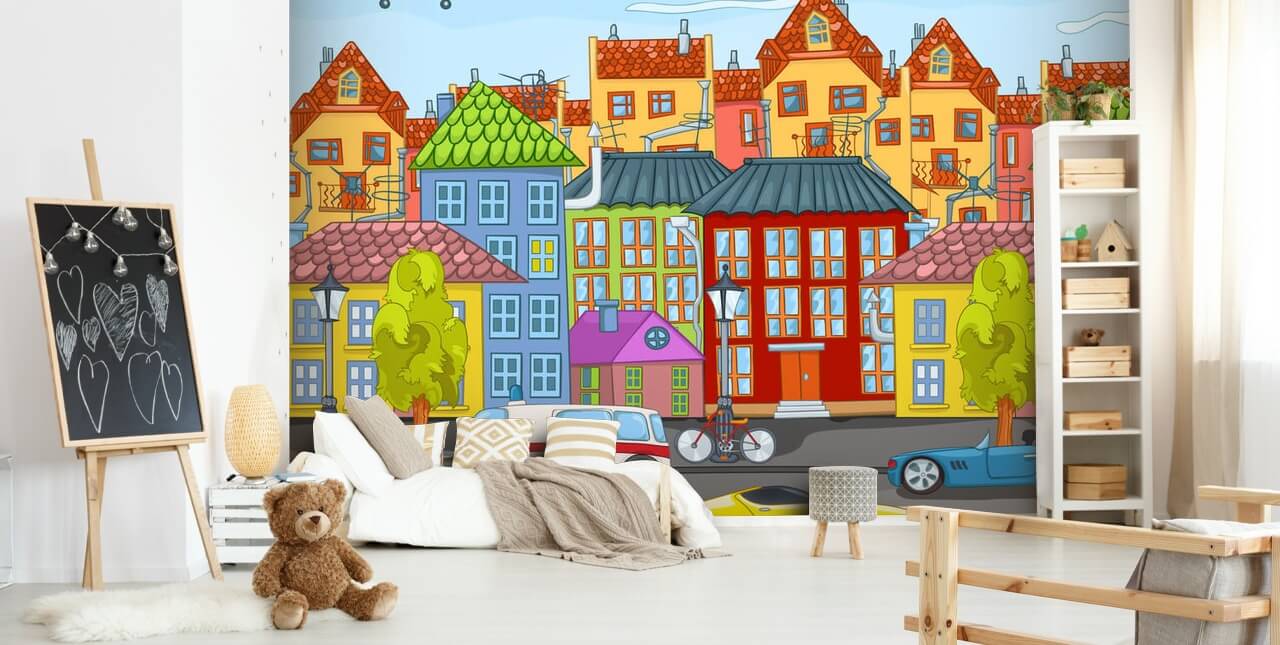 Fantastisk Tecknad stad väggmålning från Wallsauce. Denna högkvalitativa Tecknad stad tapet är skräddarsydd efter dina dimensioner.