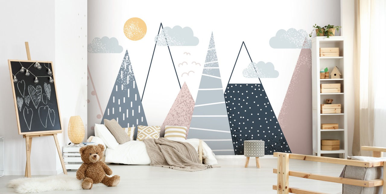 Förvandla ditt barns sovrum eller plantskola med denna snygga tapetväggmålning Cute Mountain Landscape.