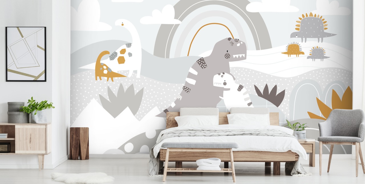 Tänd fantasi med vår söta, skandinaviska Dinosaur Mountain Wallpaper väggmålning - perfekt för barnens sovrum!