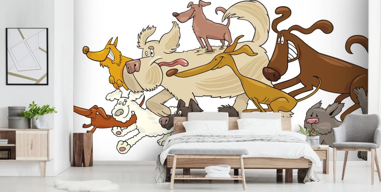 Om du har ett barn i ditt hem som älskar valpar, hundar och valpar så ska du installera denna roliga Dog Chase tapet väggmålning i sitt sovrum! Fråga ditt barn vad de tror att hundarna jagar efter? En hoppboll, frisbee eller några saftiga korv?