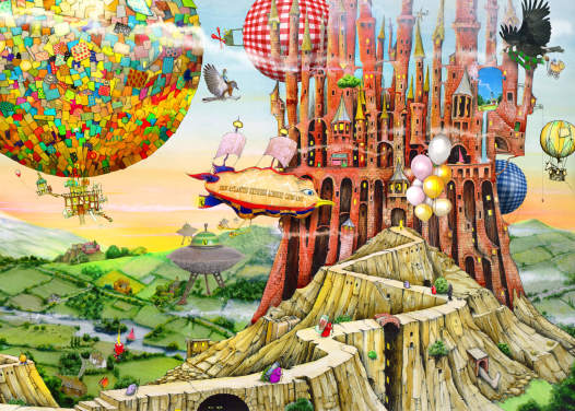 färgglad specialritad bok tapetväggmålning som heter Neverending Stories av Colin Thompson för barnets sovrum eller bibliotek