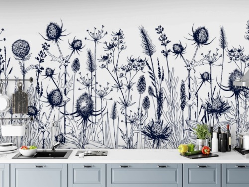 grön och vit botanisk tapetväggmålning kallad Growing Herbs at Wallsauce för kök och vardagsrum