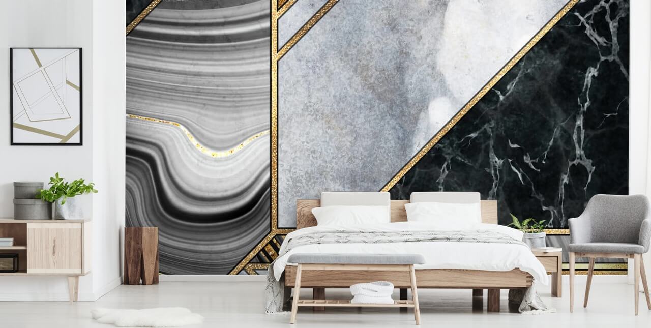 Allt vi kan säga är - wow! Vi älskar bara det snygga utseendet på denna trendiga guld- och grå marmortapet. Virveln av marmorkorn är hypnotisk och kontrasterar vackert med de vinklade guldlinjerna.