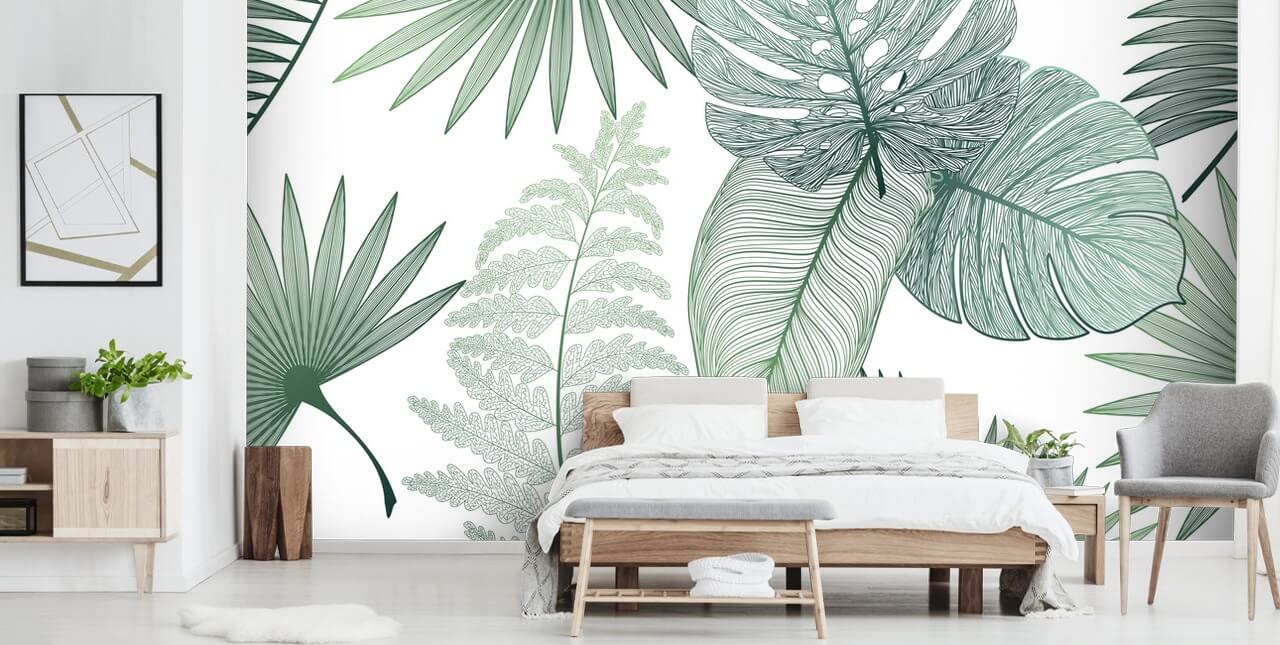 Vill du ha en vacker salvia gröntonad funktion vägg i ditt hem? Välj sedan denna gröna tropiska lövverk tapeter från Wallsauce.com.