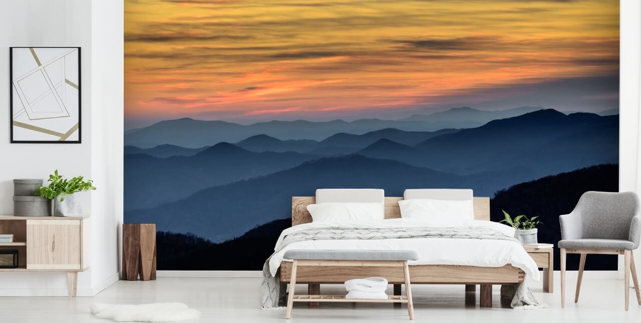Ta med denna iögonfallande bergsscen till ditt hem- eller kontorsinredning med väggmålningen Layers of the Blue Ridge Mountains.