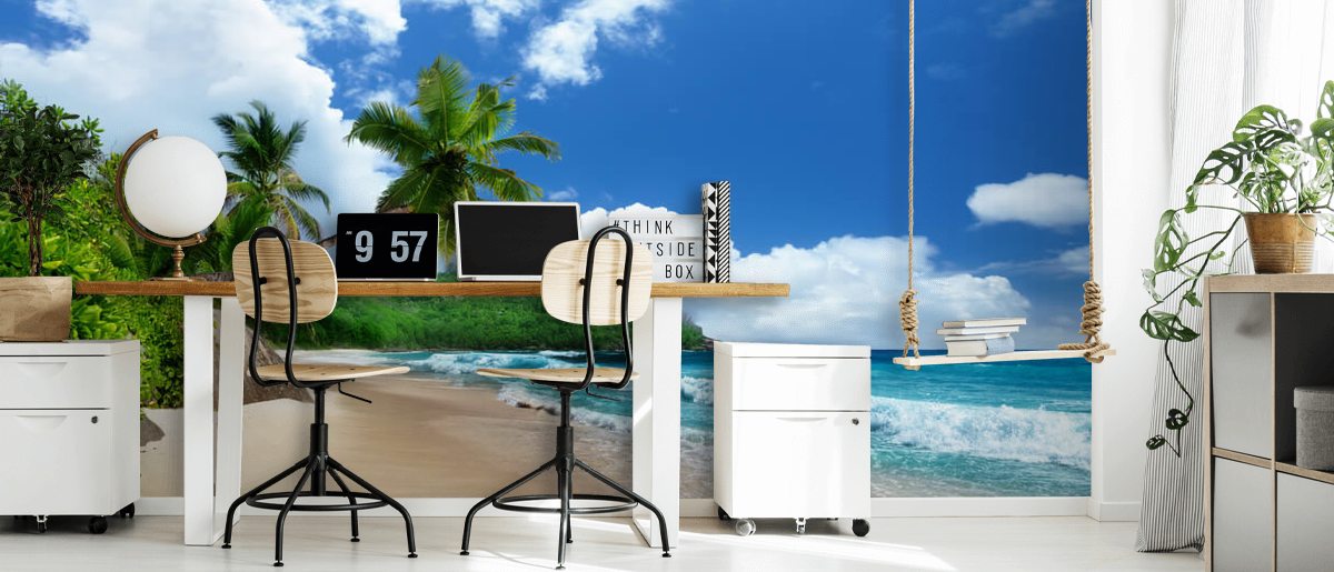 Ha en bit av Seychellerna i ditt hem med denna vackra strandväggmålning. Med sin långa sträckta gyllene sand och kristallklara hav, kommer denna fantastiska strandtapetväggmålning säkert att förändra atmosfären i ditt utrymme.