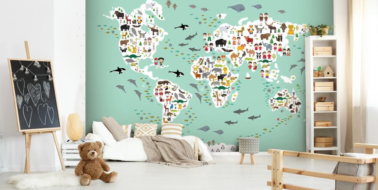Börja lära ditt barn djuren i världen så tidigt som möjligt med denna Mint Green Kids Map tapet väggmålning från WallSauce.com.