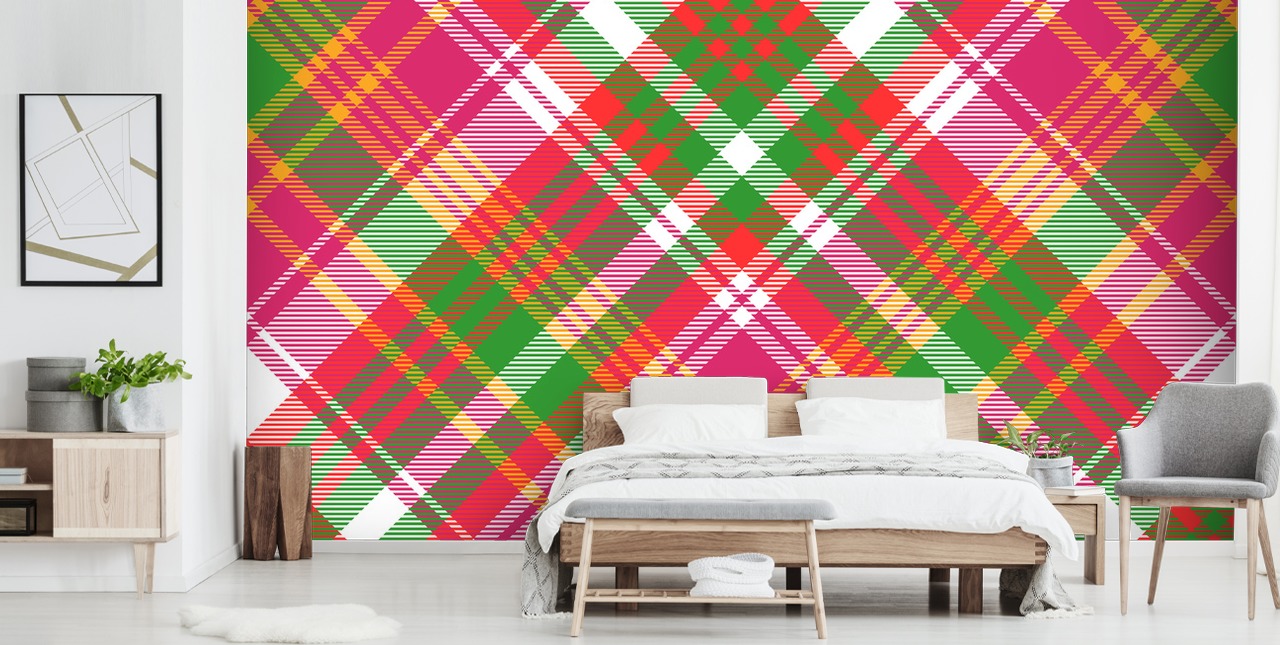 Vi tror att det skulle bli en slående vägg i en tjejs sovrum. Placera denna ljusa tartan tapet på väggen bakom eller bredvid sängen och måla väggarna vita. Välj en vit träbädd och en vit garderob. För att injicera mer färg, varför inte ha en rosa matta?