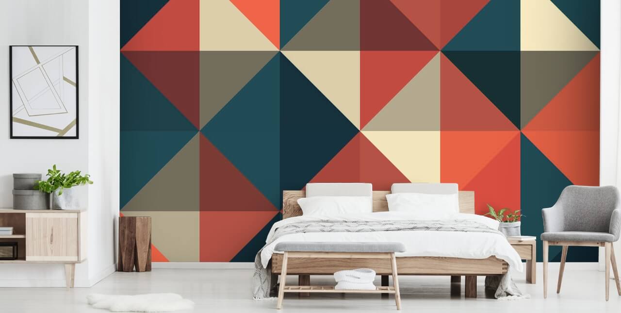 Om du vill ha symmetrisk geometri från din tapeter, är denna Retro Red och Blå tapeter exakt för dig. Perfekta trianglar i bärnsten, blått och grädde, du kommer att skapa en färgstark men ändå smakfull funktionsvägg i alla rum i din ödmjuka boning!