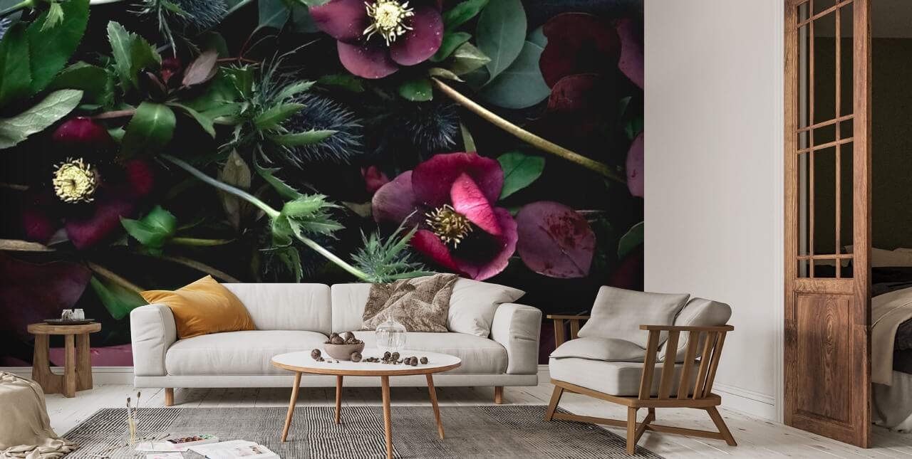 Installera denna mörka blommiga tapeter i ditt sovrum för att skapa det perfekta drömmande området. Hitta djupa lila kuddar, påslakan och kastar för att reflektera de vackra nyanser av mörk violett. Om du använder denna blomma tapeter i ditt hem, gör det mesta av skogsgröna som används i denna fantastiska väggmålning och välj en smaragd, sammet soffa.