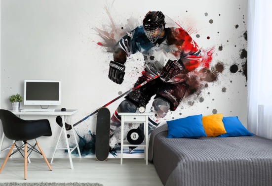 vit, blå och röd hockey tapet väggmålning kallad Ice Hockey Watercolor för barnens sovrum