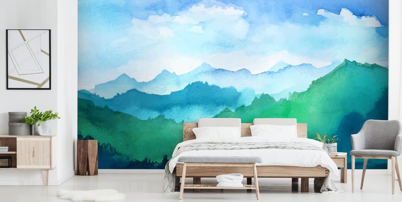 Lyft ditt bostadsutrymme med den förtrollande tapetmålningen Watercolour Mountains, med fantastiska nyanser av grönt och blått som fångar essensen av majestätiska landskap.