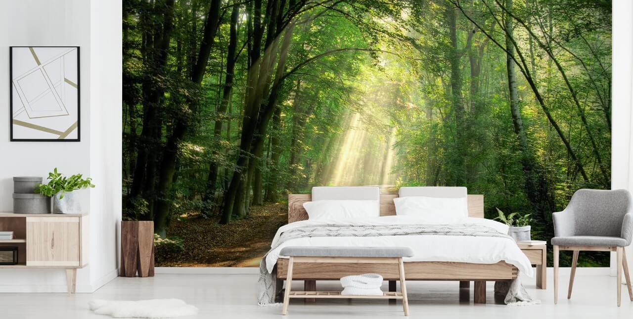 Ta lugn i ditt hem med denna skräddarsydda Woodland Sunlit Track tapet från WallSauce.com.