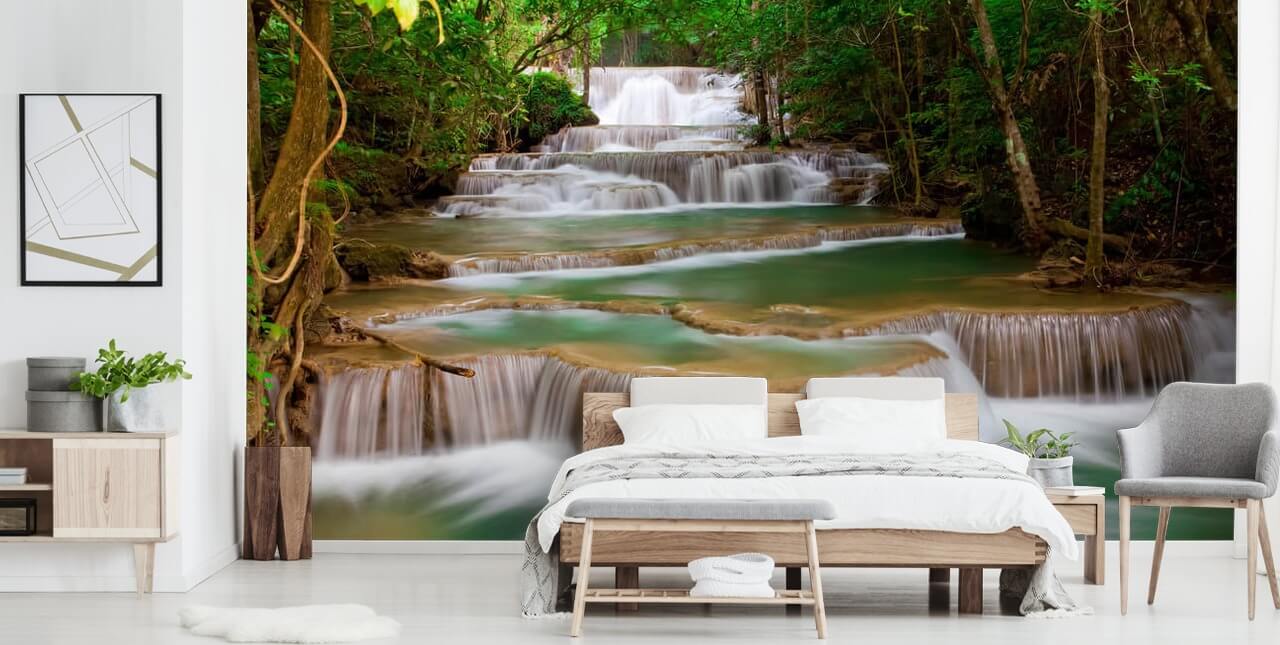 Smycka din vägg med denna skräddarsydda Woodland Waterfall väggmålning. Levereras i paneler och lätt att installera.