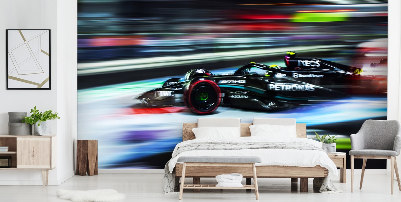 The creation process involves printing the design using state-of-the-art equipment that ensures high-resolution images and vibrant colors that won't fade over time. Transform your interiors into a fan's paradise with our F1 wallpaper!