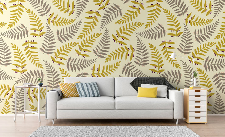 A floral mustard wallpaper that features pretty botanicals on a light background will add a sense of brightness and airiness to your room. There are many gentle, muted mustard murals that work perfectly well for the spring/summer season.