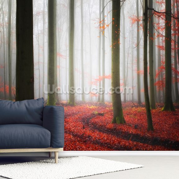 If Fall is your favourite season of the year, why not enjoy it all year round with this beautiful Autumnal Tracks wallpaper? Rich in tones of fiery red, pair this gorgeous tree wallpaper with red accessories as well as natural wooden furniture. If you choose to install this autumn forest wallpaper in your lounge, why not have a brown leather couch with red cushions, a red rug, and curtains? With all that red, try to make the rest of the room as subtle as possible with pastel grey or off-white painted walls.