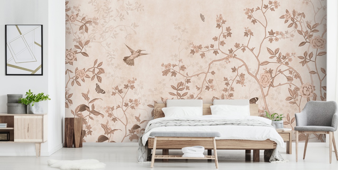 Beige Birds and Butterflies is a beautiful wall mural that can completely transform the ambiance of your hallway, dining room, bedroom or living room. It's a gorgeous beige color that complements a range of decor choices.