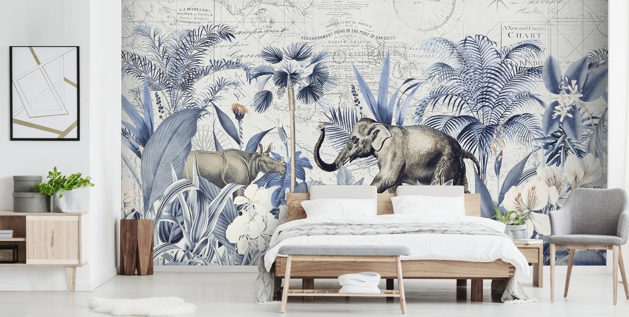 Give your home a feature wall to be proud of with this stunning Blue Elephant Vintage Map wallpaper mural.