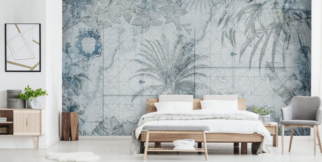 Enjoy this exotic Blue Tropical Fauna and Map wallpaper mural from Wallsauce.com.