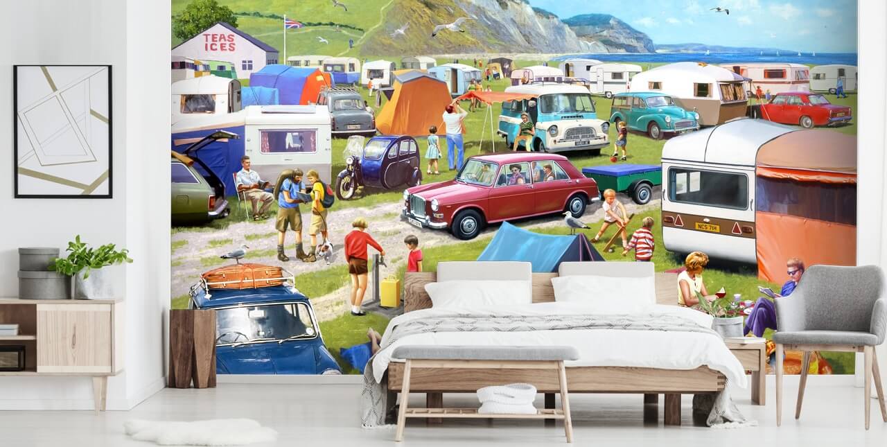 Remember those happy summer holidays spent by the UK coast with this custom-made Camping and Caravanning wallpaper on your wall!