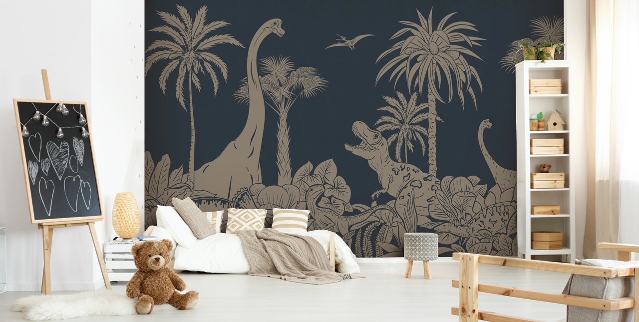 If your little one loves dinosaurs, then they'll love the Monochrome Dino - Vintage Blue wall mural from artist Kikki Belle.