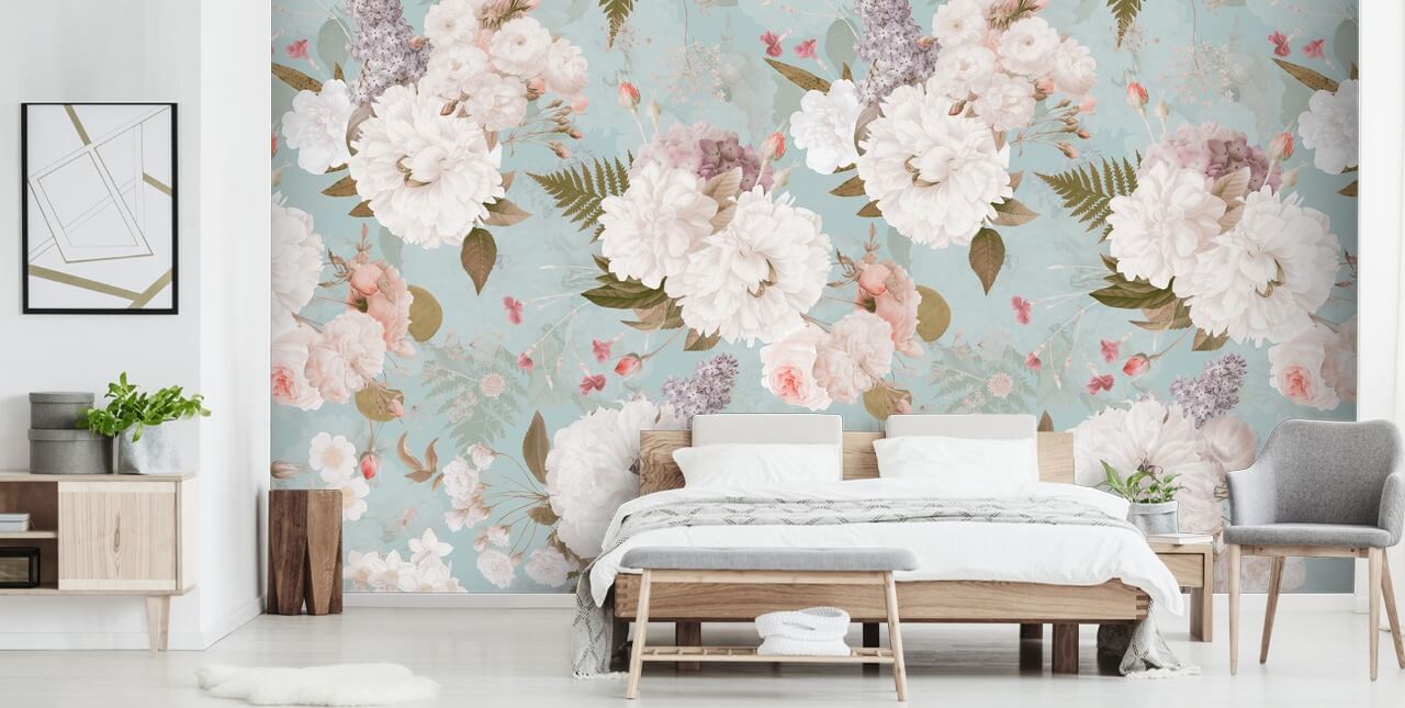 Bring beauty to your home with this custom-made Pastel Blue Vintage Peonies wallpaper mural from Wallsauce.com. This pretty peony wallpaper would look fabulous in a wide range of rooms - an idyllic bedroom, cottage-styled living room or even a cute baby’s nursery!