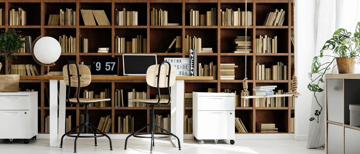 For the rest of the room’s décor, choose a range of beige and cream items to mirror the shades in the bookshelf. Imagine a cream armchair, nutty beige carpet as well as a walnut wood desk and chair for working at.