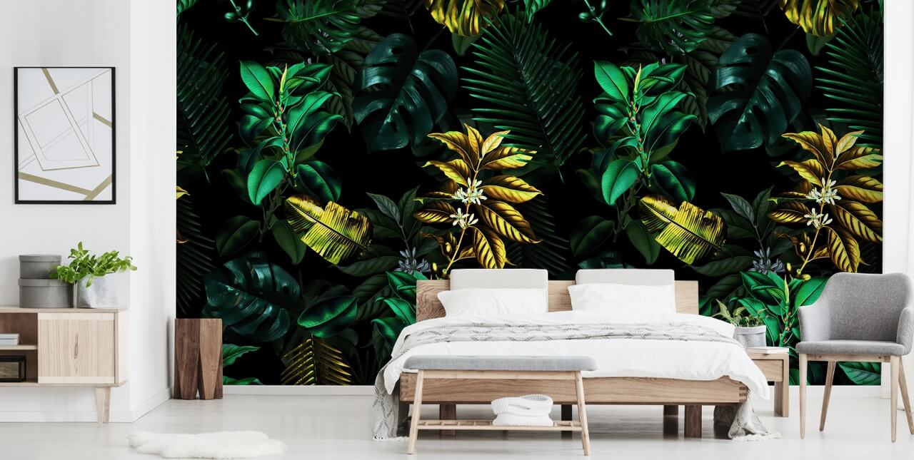 Want a striking wallpaper for your home? Then choose this dark and luxurious-looking Tropical Dancing Leaves wallpaper from Wallsauce.com.
