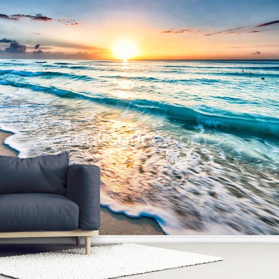 Install this custom-made Cancun Beach Sunrise, Mexico wallpaper. Available in peel and stick or paste the wall wallpaper.