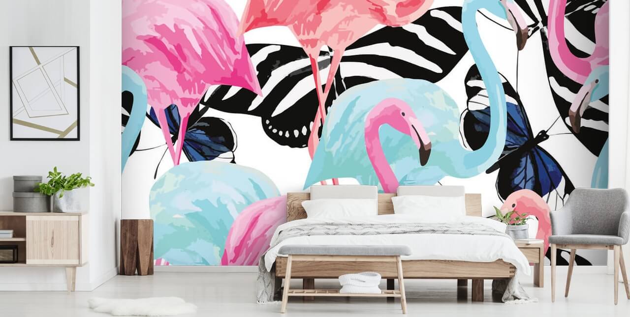 Transform any wall with the enchanting Flamingos with Butterflies mural, a vibrant addition that brings personality and flair to any room in your home, office, or business. Bursting with color and charm, this mural captures a playful scene that effortlessly livens up a dull wall, turning it into a stunning focal point.