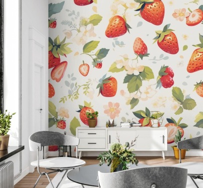 bright red fruit wallpaper mural called Strawberries Fresh for kitchens, cafes and restaurants