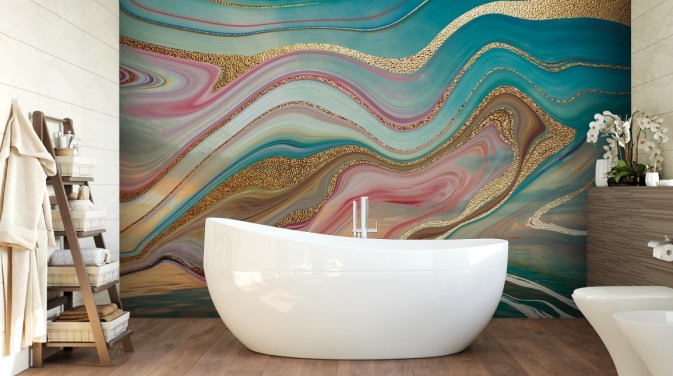 pink and turquoise custom marble wallpaper mural called Omber Strata by Lara Skinner for bedrooms